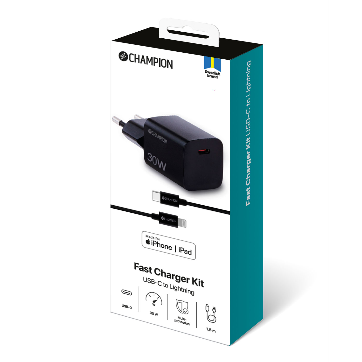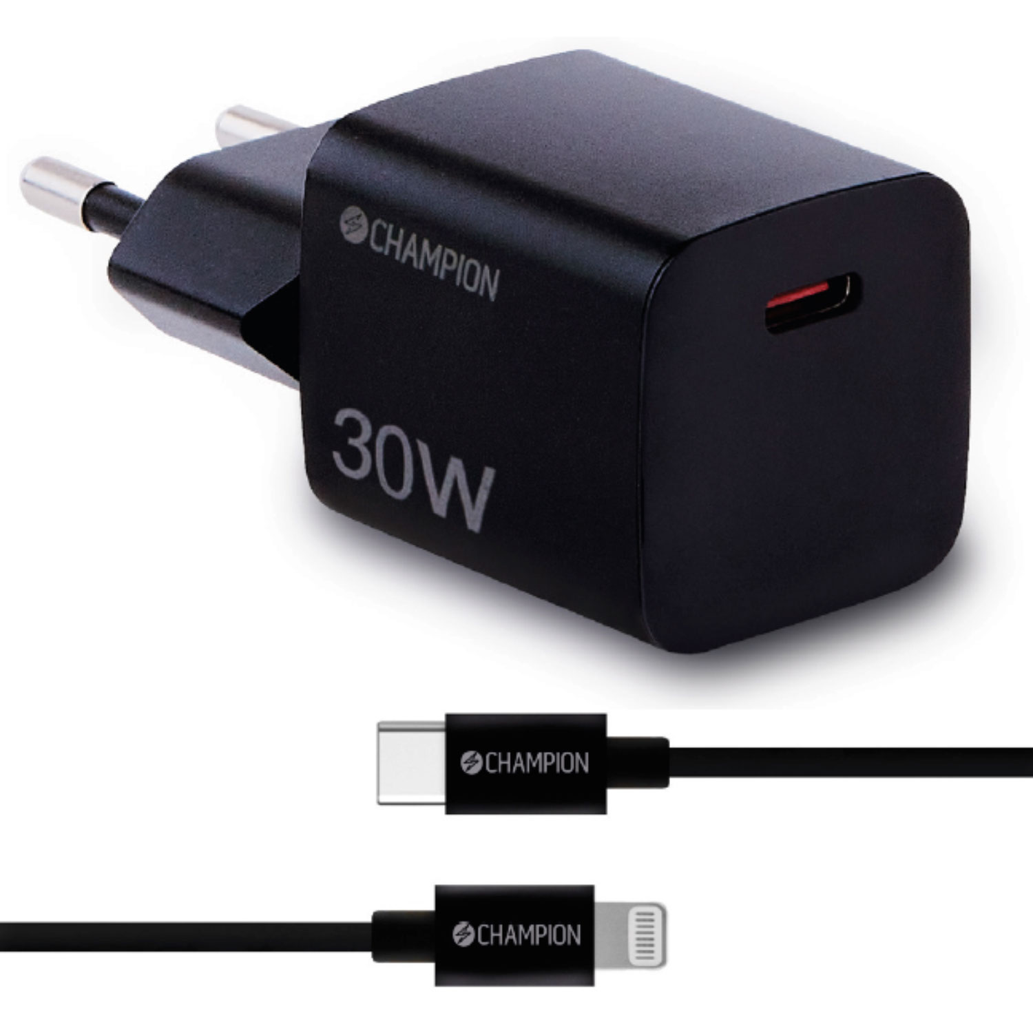 CHAMPION VÄGGLADDARE 30W USB-C TILL LIGHTNING 1,5M SVART